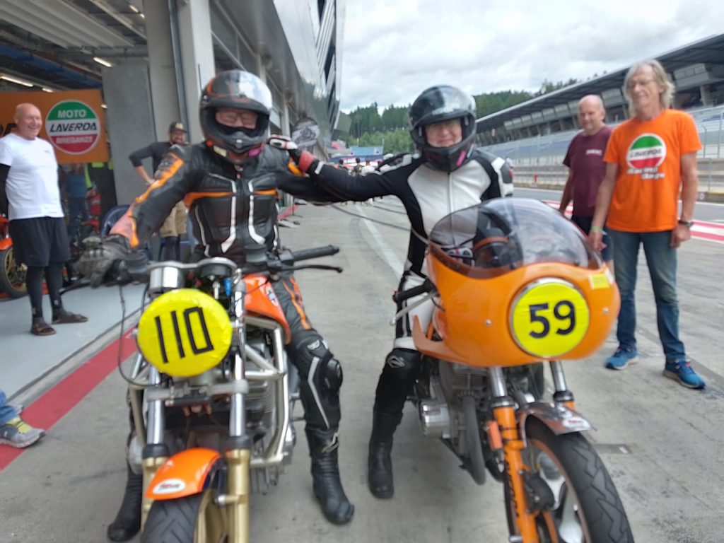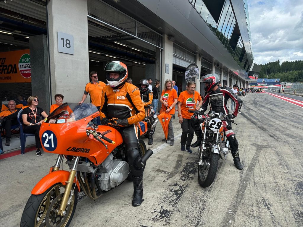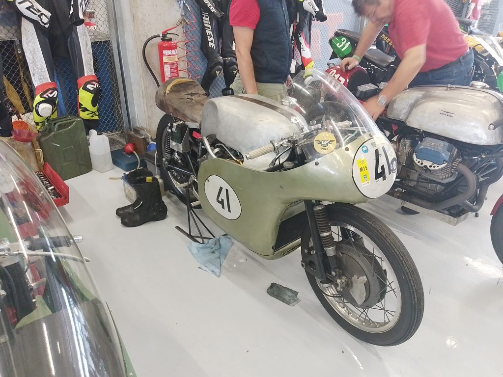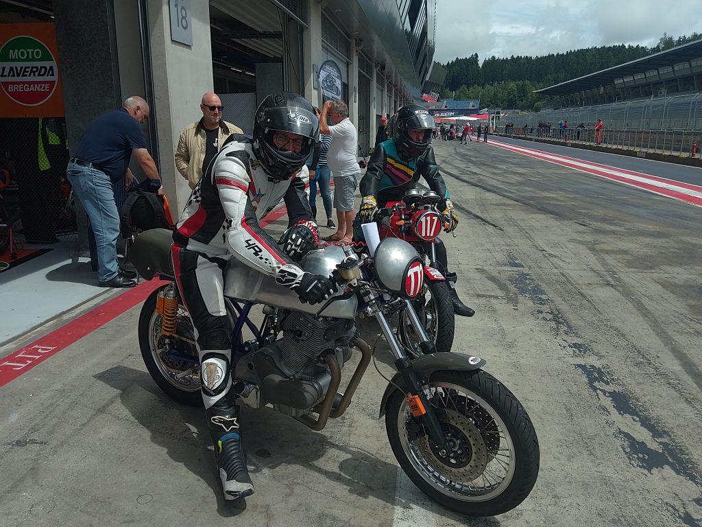 Lucas brachte seine Eigenbau Laverda erstmals an den Start. Willi startete seine Spaceframe für die Parade und ich meine Motoplast. Bei den Trainings fuhr ich sehr zurückhaltend, da ich ja noch Metallteile von meinem Unfall letztes Jahr mit mir rumschleppe.